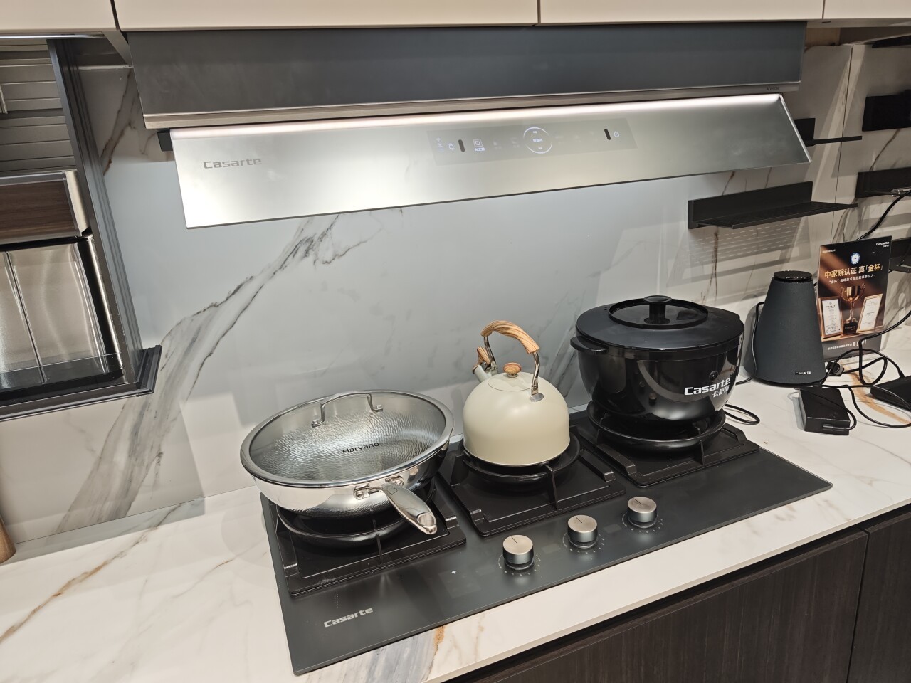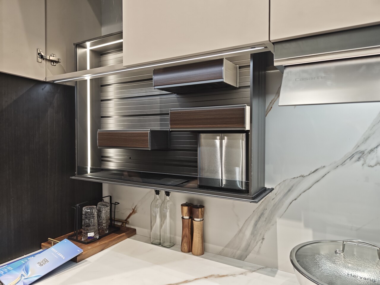 在功能上,现场特地为我们展示了一种比较新奇的“烟柜”联动,简单来说,就是在不用的时候,调料柜会自动收起来,而当我们在打开燃气灶的时候,调料柜会自动下降,方便拿取烹饪用具。
