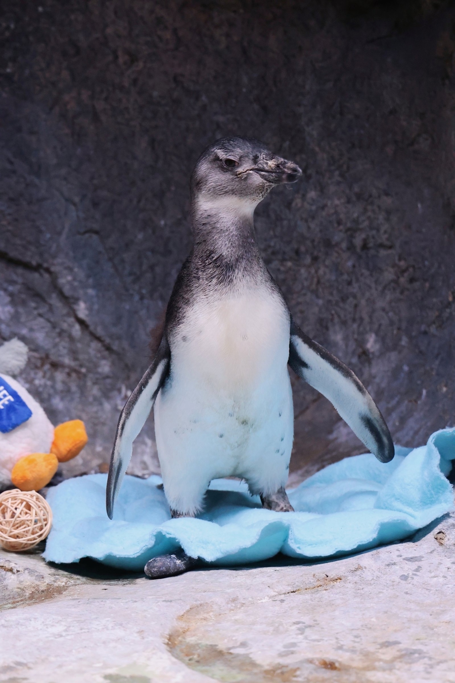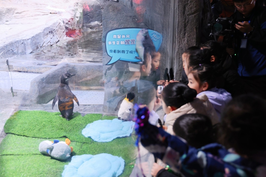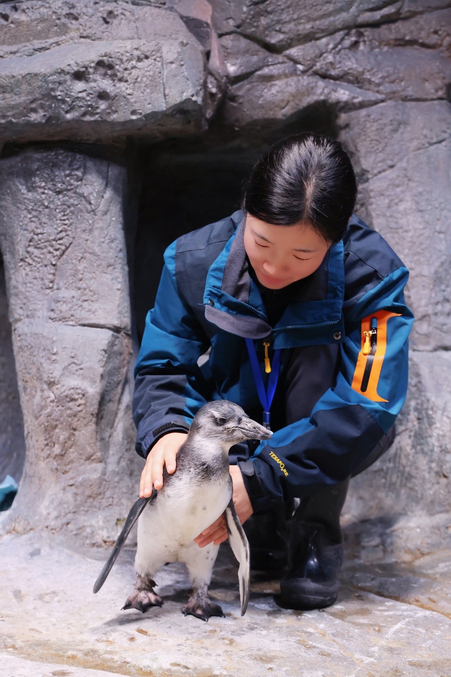 市民游客在还原非洲企鹅原生栖息环境的“巨砾海滩”展区,与企鹅宝宝“茂茂”温情会面。非洲企鹅(斑嘴环企鹅)已于2024年被列为“极度濒危”物种,圈养繁殖难度极大。“茂茂”破壳时曾遇难关,保育团队立即启动24小时看护,像“临时爸妈”一样精心喂养,帮助它从仅61.3克的幼崽健康长大。