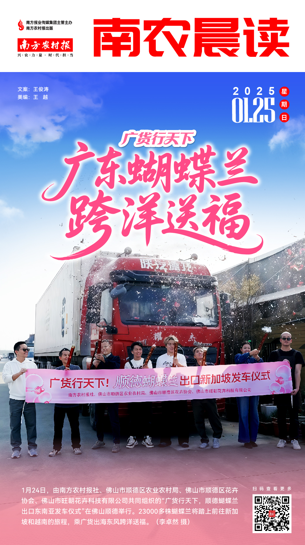 广货行天下,广东年花发车东南亚!1月24日上午,由南方农村报社、佛山市顺德区农业农村局、佛山市顺德区花卉协会、佛山市旺朝花卉科技有限公司共同组织的“广货行天下!顺德蝴蝶兰出口东南亚发车仪式”在佛山顺德举行。活动现场,6000多株精心培育的精品蝴蝶兰已整装装柜完毕,这批带着新春祝福的蝴蝶兰将奔赴新加坡;下午,另一批出口规模更大的年花货物也已准备就绪,17000多株蝴蝶兰将踏上前往越南的旅程。详情>>>